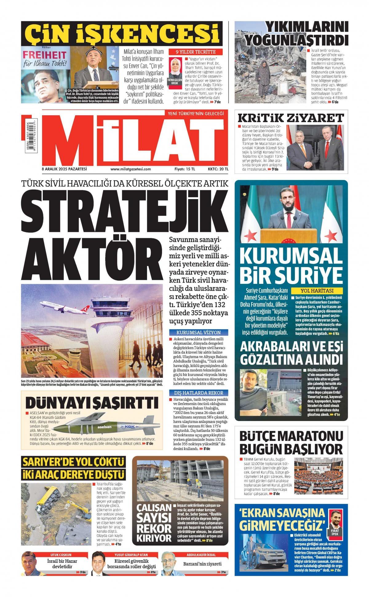 Milat Gazetesi 8 Aralık 2025 Günü Manşeti