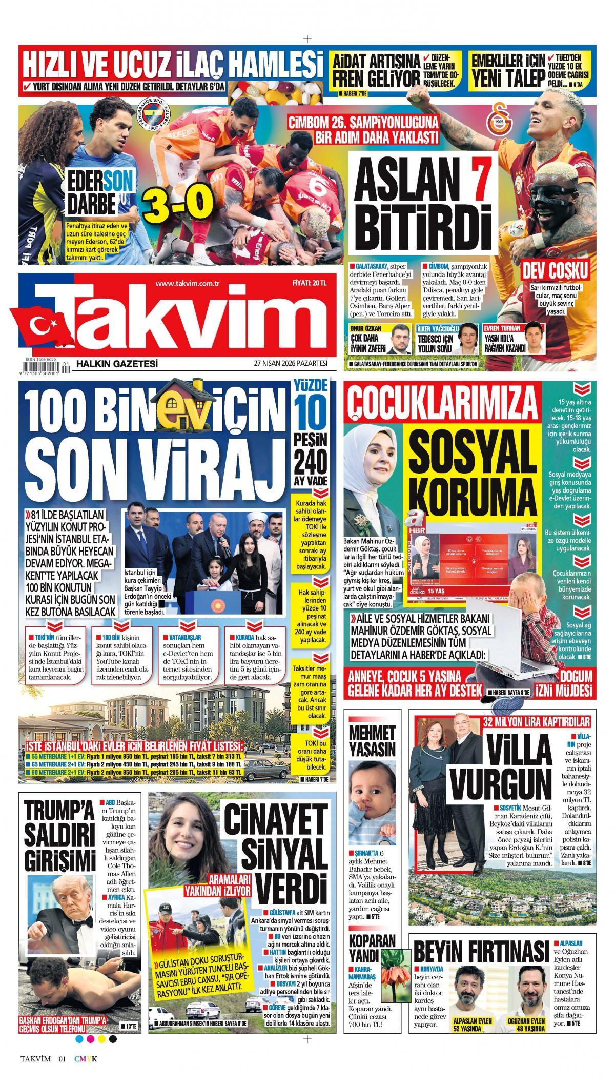 Takvim Gazetesi 27 Nisan 2026 Günü Manşeti