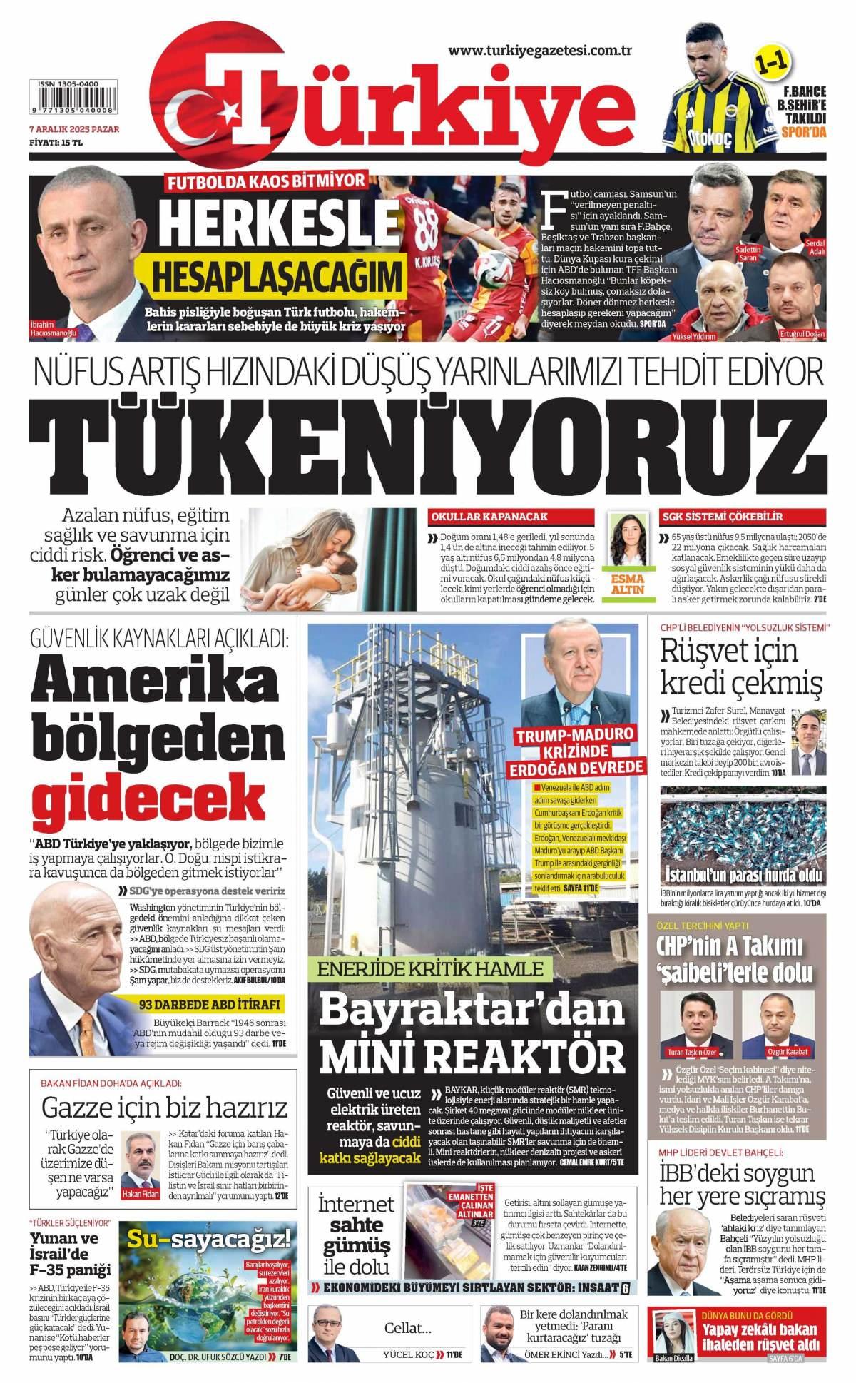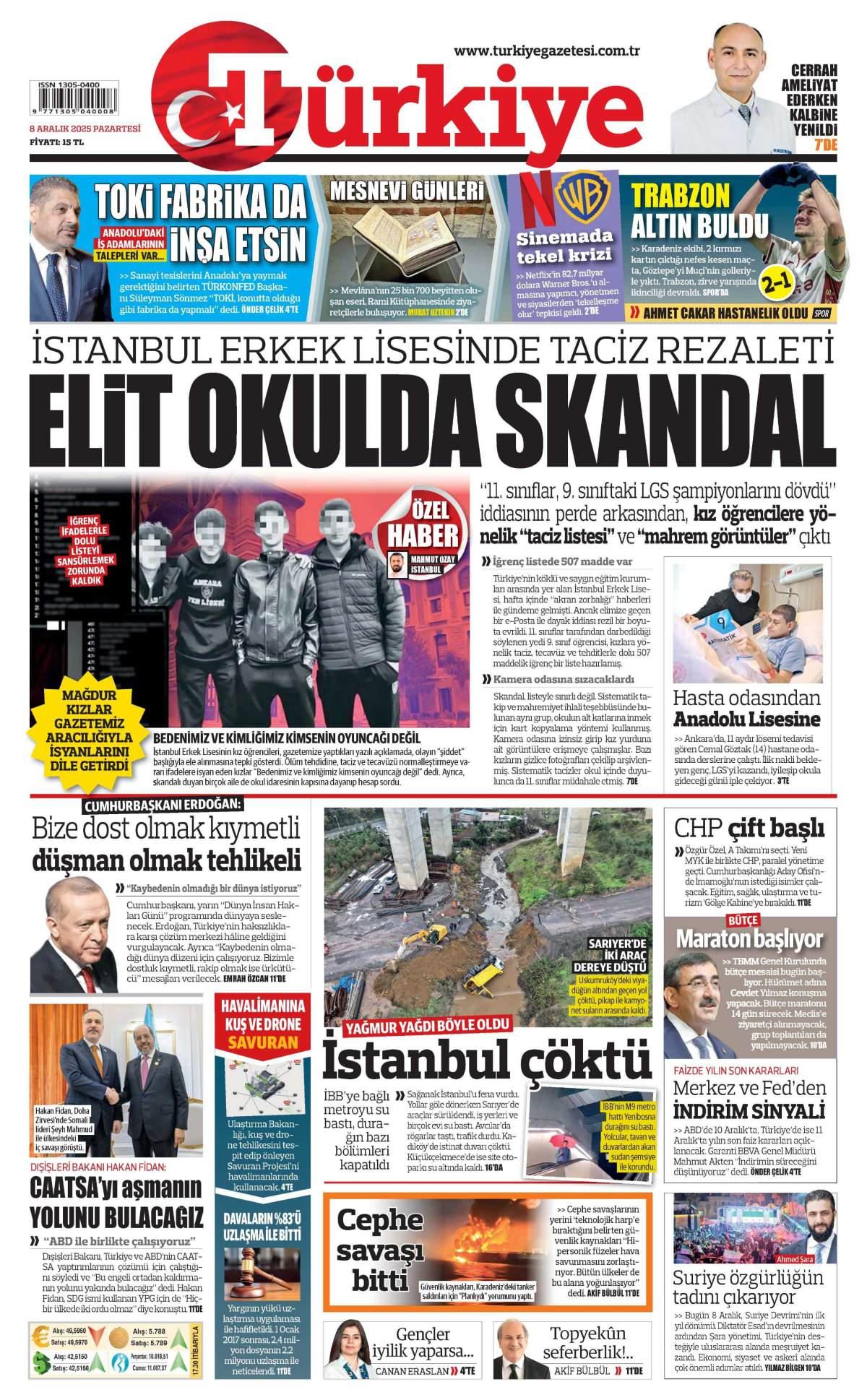 Türkiye Gazetesi 8 Aralık 2025 Günü Manşeti