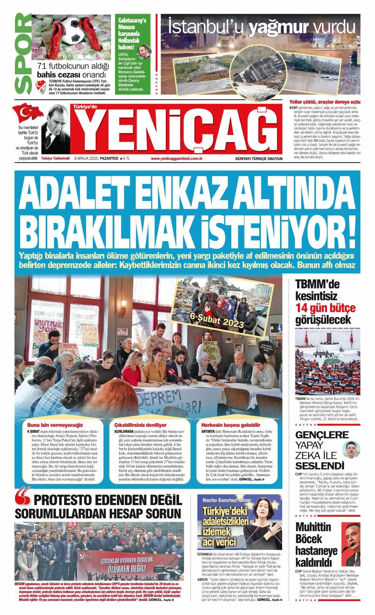 Yeni Çağ Gazetesi 8 Aralık 2025 Günü Manşeti